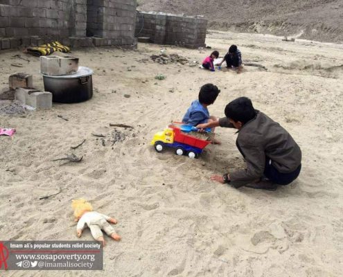 Distribution of toys among children affected by floods in the village of Lirei by members of the Imam Ali Society