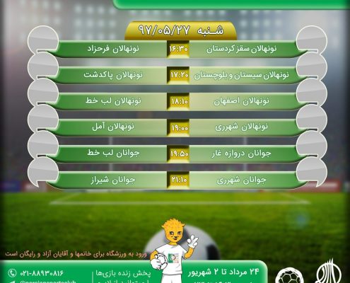 شنبه ۲۷ مرداد، ساعت ١۶:٣٠ تا ٢٣ ولنجك، زمین چمن دانشگاه شهیدبهشتی